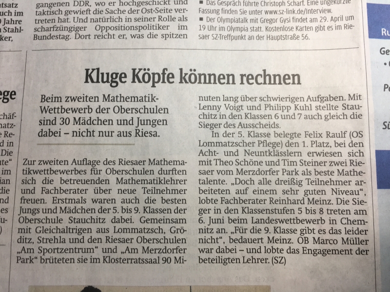 Zum zweiten Mal nahmen Schüler und Schülerinnen unserer Schule am Riesaer Mathematikwettbewerb für Oberschulen teil. Im schönen Ambiente des Klostersaales in Riesa hieß es für 90 Minuten konzentriert Matheaufgabe lösen – und das ganz freiwillig. Stolz sind wir auf unsere Ergebnisse: