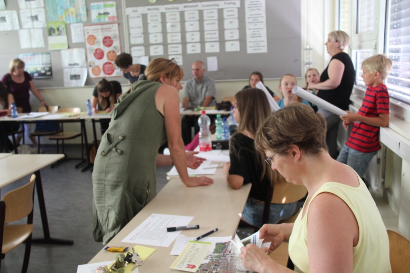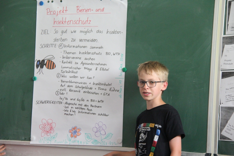 Im zweiten Schritt wurden die neuen Themen und Projekte aufgerufen und geschaut, was in der Konferenz bearbeitet werden sollte. Es bildeten sich 4 Themenarbeitsgruppen, die erste Ideen und nächste Schritte zur Umsetzung des Themas entwickelten. So wird es zum Beispiel im neuen Schuljahr eine große Aktion „Rettet die Bienen“ gemeinsam mit unseren Kooperationspartnern geben. Die Idee brachten Schüler der 6. Klasse ein.