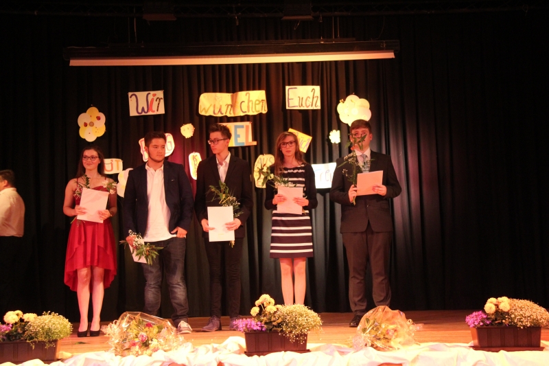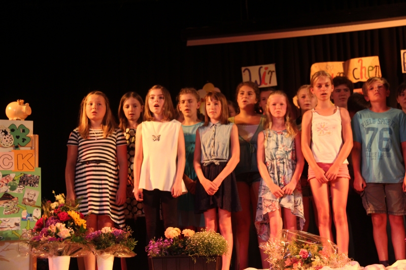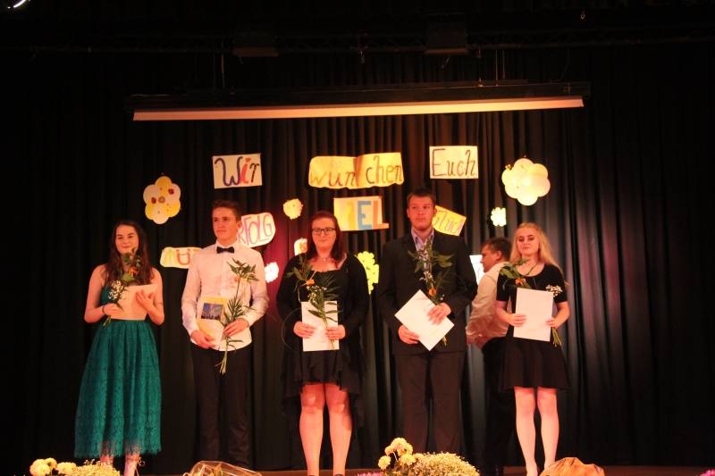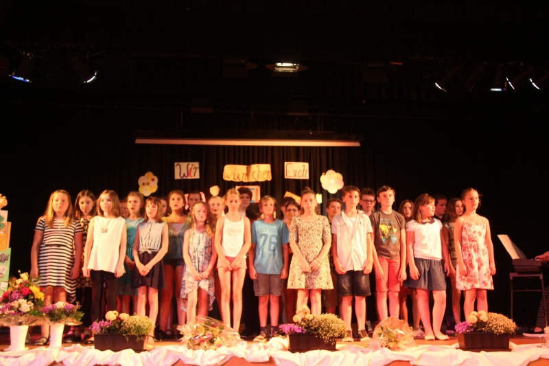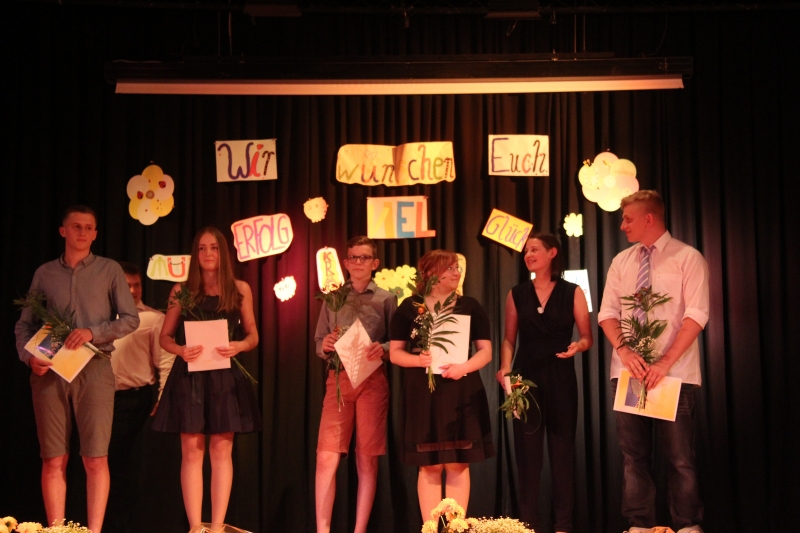 Der große Saal im Schützenhaus bot einen würdigen Rahmen für den Abschied. Auf der Bühne waren liebevoll gestaltete Abschiedsgrüße unsere Sechstklässler am Wünsche Baum angebracht. Ein Chor aus Schülerinnen und Schülern der 5. und 6. Klassen sang bewegende Abschiedsgrüße. Besonderes Highlight waren die Sologesangseinlagen während der Zeugnisübergabe. So hatte z.B. unser Pascal den Mut, auf seiner eigenen Zeugnisausgabeveranstaltung zu singen – ein riesiger Beifall war sein Lohn.