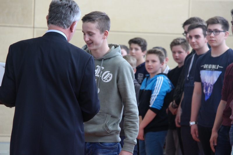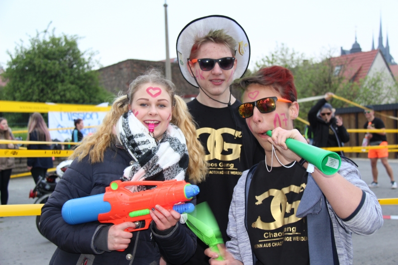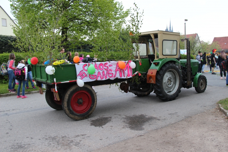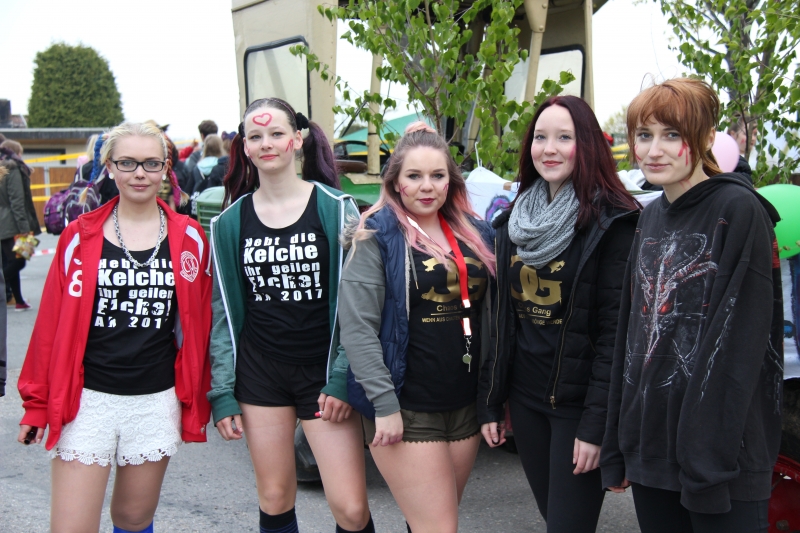 Der letzte Schultag für die Zehner sollte in diesem Jahr der 4. Mai sein. Jahrelange Traditionen bestimmten den Morgen – die jüngeren Schüler waren nicht immer begeistert, wenn sie eine sehr ungewöhnlich ausgestattete Schule betreten mussten. Viele trugen mit Freude ein Lippenstiftherzchen und den „AK 17“ – Schriftzug auf den Wangen. Nach der Frühstückspause luden dann die nun fast „ehemaligen Schüler“ alle Klassen zur Schulversammlung in die Turnhalle ein und schafften richtig gute Stimmung.