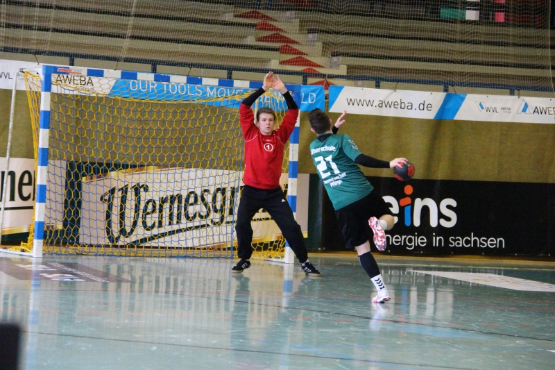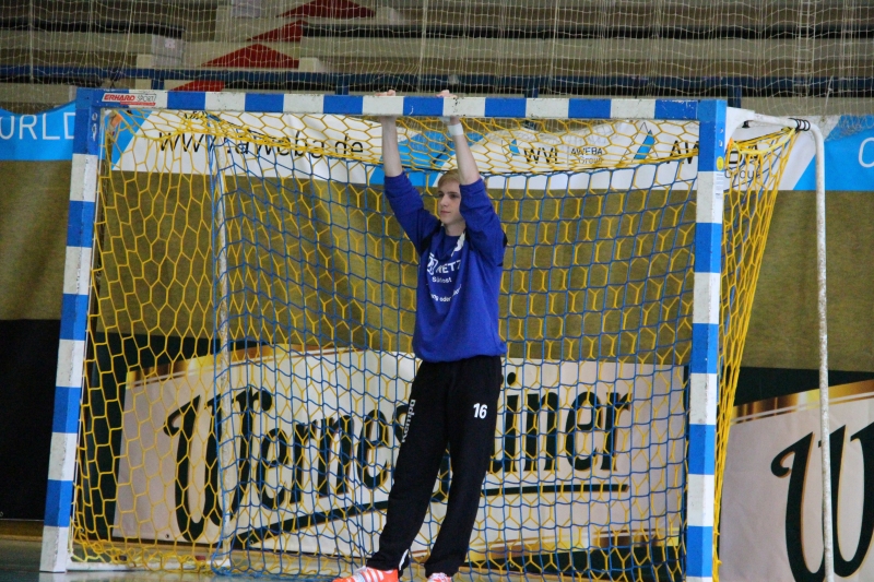Nach der Mannschaftsbesprechung und Auslosung der Reihenfolge der Spiele hatten unsere Jungen ihren ersten Auftritt gegen Werdau. Ein bisschen Nervosität ging einher, was sich im Angriff als auch in der Verteidigung bemerkbar machte. Werdau hatte bereits ein Spiel hinter sich, sie verloren gegen Borna mit 14:15. Ausgeglichen verlief die erste Halbzeit (6:6), der zweite Spielabschnitt gestaltet
