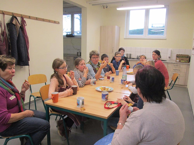 Bereits zum zweiten Mal in diesem Jahr trafen sich einige Seniorinnen aus dem Projekt „Mahlzeit“ des Caritas Verbandes Meißen mit Schülerinnen und Schüler der Klasse 5 aus dem Projekt Kompass, zum gemeinsamen Backen. Dafür nutzten wir unsere tolle, große Lernküche der Schule. Ziel war es, nicht nur Rezepte auszutauschen und gemeinsam Plätzchen für die Weihnachtszeit zu backen, sondern auch ins Gespräch zu kommen. Was haben drei Genrationen gemeinsam? Gibt es da Unterschiede und wirklich andere Sichtweisen? Nach einer kleinen Kennlernrunde erzählten alle zwei Generationen etwas über ihr Leben. Spätestens bei der Vorstellung der eigenen Hobbys, wurde festgestellt, dass es viele Gemeinsamkeiten gibt und sich einige Sichtweisen wiederholen. Die Schüler_innen staunten, welche Hobbys, oft ähnlich den ihren, die ältere Generation haben und wie viele sich noch ehrenamtlich engagieren. Bei einer kleinen Abschlussrunde mit Kinderpunsch und gebackenen Makronen, stellten wir fest, dass noch viele Fragen an beide Generationen offen blieben. „Wie war Ihre Schulzeit damals?“ – „Was gab es in der Schulküche zu essen?“ -„Welche Regeln galten?“, waren noch offene Fragen an die Seniorinnen. Und im Gegenzug: „Wie ist eure Schule heute“ – „Wie viele  Angebote gibt es“ und „Welchen Schulabschluss kann man heute erreichen?“ Der Wunsch blieb, sich im neuen Jahr noch einmal zu treffen, um Gespräche in gemütlicher Runde mit unseren „Zeitzeugen“ zu führen. So planen wir im ersten Quartal des neuen Jahres eine weitere, ausführlichere Gesprächsrunde von zwei unterschiedlichen Generationen, welche doch vieles gemeinsam haben.