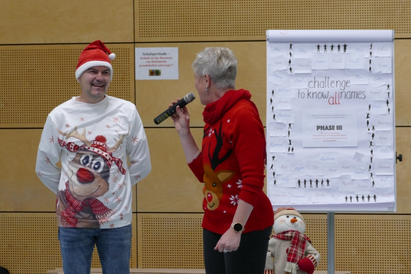 Der Höhepunkt des Tages war zweifelsohne Herr Ulm´s „challenge to know all names“. Herr Ulm wagte sich an die Herausforderung, alle Namen der knapp 400 Schülerinnen und Schüler auswendig zu lernen. Mit beeindruckendem Einsatz und viel Enthusiasmus schaffte er es, dieses Vorhaben erfolgreich umzusetzen.