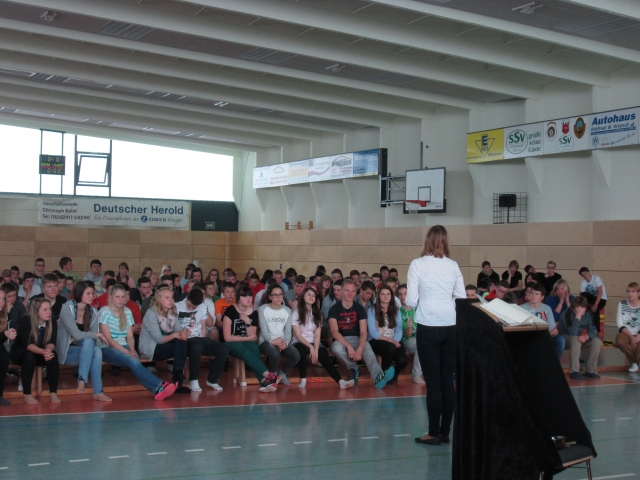 Am 11. Mai fand in unserer Oberschule Lommatzscher Pflege ein interessantes Theaterstück zum Thema Drogen zur Aufführung statt. Das Galli Präventionstheater aus Dresden präsentierte für alle Schüler-Innen der Klassen 7 bis 10 „Die Geisterstunde“. Die Kapazität der großen Turnhalle gab allen Zuschauer_Innen ausreichend Platz und so wurde mit einfachen Mitteln diese, zu einer Theaterkulisse, umgestaltet. Das Theaterstück war ein Soloprogramm und wurde von der Schauspielerin Petra Meußel sehr anschaulich und professionell in Szene gesetzt. Die Geschichte erzählte von einer jungen Frau, welche durch mehrere Umstände und schwierigen Lebenssituationen im Drogenrausch fiel, tiefe Abgründe erfuhr und deren Leben eigentlich zum Scheitern verurteilt war. All das hatte sie in ihrem Tagebuch erfasst. Am Ende erkannte sie ihren Absturz und erhielt eine zweite Chance, indem sie täglich kreativ ihr Leben gestalten sollte … . Diese Chance bekam sie, indem sie „erlöst“ wurde, durch eine Person im Zuschauerraum, die ihr zum Schluss die Hand reichte. Am Ende des Stückes gab es durch das Galli Theater eine aktive Nachbereitung. Die Schüler_Innen konnten Fragen stellen sowie Eindrücke und Vorschläge einbringen. Nach der Mittagspause hatten alle Schüler-Innen eine etwas andere Unterrichtsstunde, eine Feedbackrunde, mit ihren Klassenlehrer_Innen. Hier erhielten sie die Möglichkeit in ihrem Klassenverbund über das Stück an sich und vor allem über das Thema Drogen mit all seinen Facetten zu sprechen.